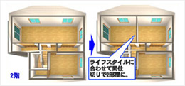 生活空間を自由にレイアウトできるスケルトンインフィルを採用。建物の骨格(構造躯体)と内部(間取り)を別々に分けて計画する考えをスケルトン(骨格)&インフィル(内部)と呼びます。少ない費用で間仕切り壁をつけたり外したりすることができますので、ライフスタイルに合わせたレイアウトが可能となります。 例えば、お子様が小さいときは広々とした遊べる空間に、お子様が成長すれば間仕切りをしてプライベート空間に変更することができます。